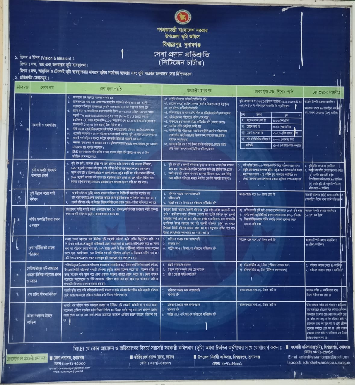 | ০১. | নামজারী ও জমা খারিজ | আবেদন প্রাপ্তির পর যথাযথ তদন্ত পূর্বক পক্ষগণকে নোটিশ প্রদানক্রমে শুনানি গ্রহণ সাপেক্ষে কোন আপত্তি না থাকলে অনুমোদন। ক) আবেদন বাবদ কোর্ট ফি ২০.০০(বিশ) টাকা। খ) নোটিশ জারী ফি ৫০.০০(পঞ্জাশ) টাকা (অনধিক ৪ জনের জন্য)। গ) রেকর্ড সংশোধন ফি ১০০০.০০ (এক হাজার) টাকা। ঘ) প্রতি কপি মিউটেশন খতিয়ান ফি ১০০.০০(একশত) টাকা। সর্বমোট= ১১৭০.০০ (এগারশত সত্তর) টাকা এখানে উল্লেখ্য যে, আবেদন বাবদ ২০.০০ (বিশ) টাকা কোর্ট ফি এর মাধ্যমে এবং অবশিষ্ট ফি ডি.সি. আর এর মাধ্যমে আদায় করতে হবে। | ৪৫(পয়তাল্লিশ)দিন | অতিরিক্ত জেলা প্রশাসক (রাজস্ব)বরাবরে নামজারী আপিল দায়েরকরণ। |